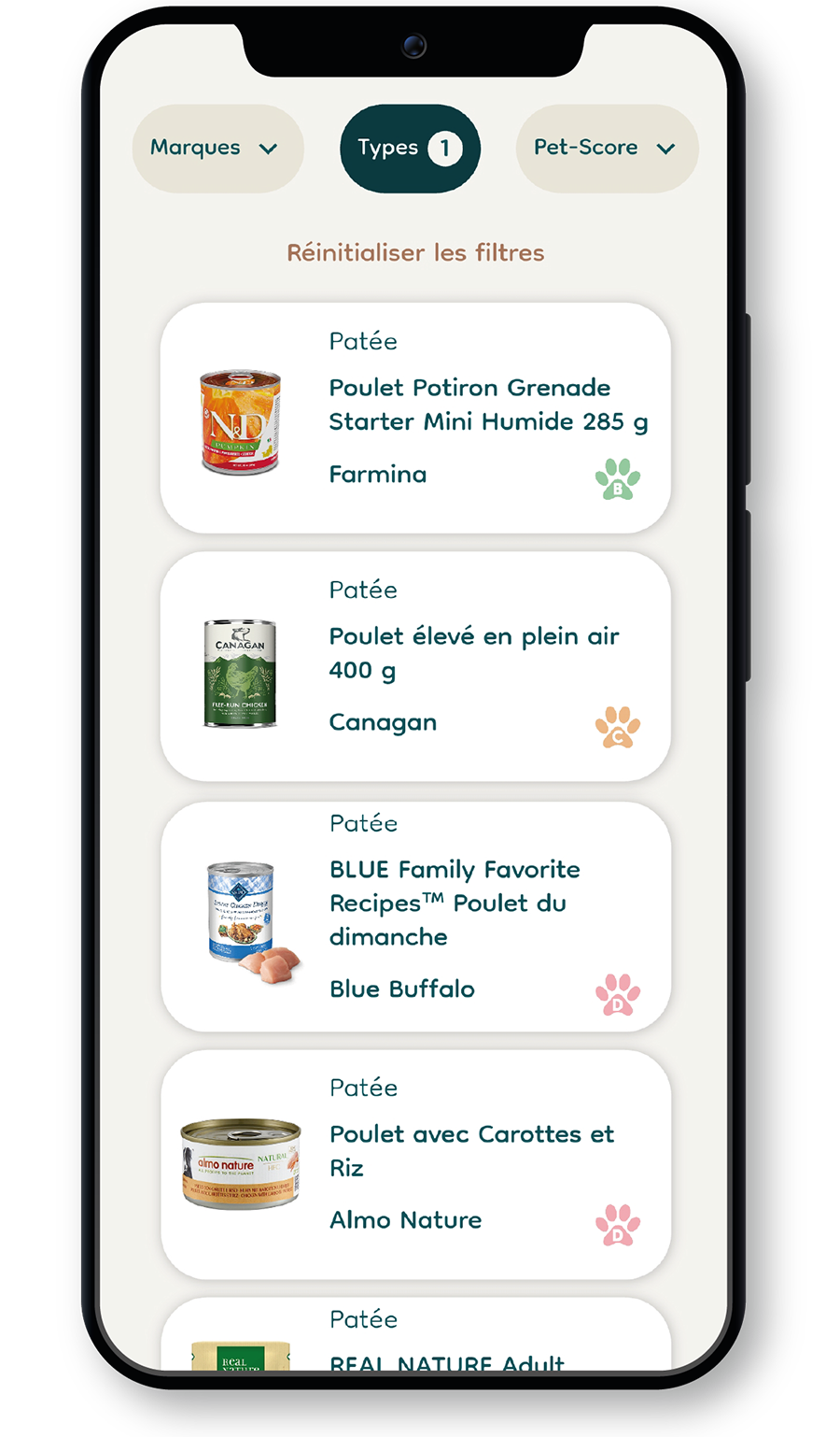 Grâce à notre Pet-score, une note claire de A à E, tu sais immédiatement si une recette est équilibrée, riche en protéines, trop grasse ou si elle contient des additifs nocifs ou bénéfiques.